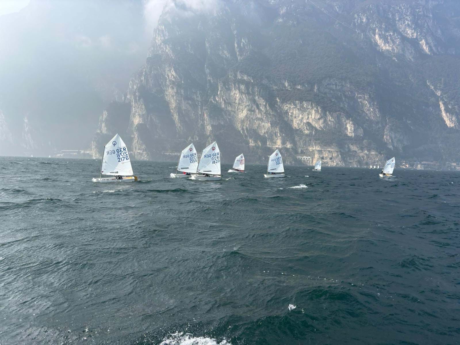 An diesem Tag begann endlich die Regatta. Insgesamt waren es ca. 400 Boote, was sogar ein bisschen wenig für eine Gardasee Opti Regatta ist. Um ca. 13 Uhr war Delta oben, und wir fuhren drei Races bei guten Bedingungen. Das war auch das Maximum, was gefahren werden durfte. Der Kurs war der typische Gardasee-Kurs: Es heißt auch bda-Kurs.